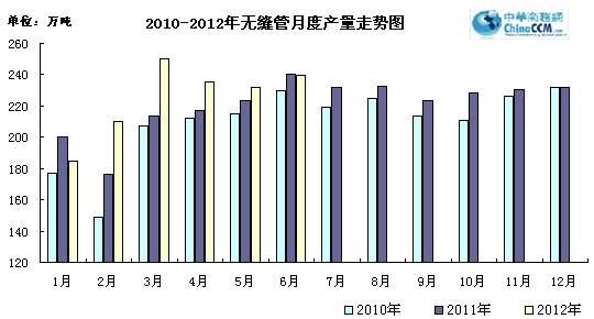 6月份國內生產無縫管239.9萬噸,同比增長2%。環比5月份增產7.9萬噸,環比增長3.4%。上半年累計生產無縫管1334.4萬噸,同比增長8.3%。預計全年無縫管產量可突破2700萬噸。