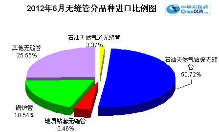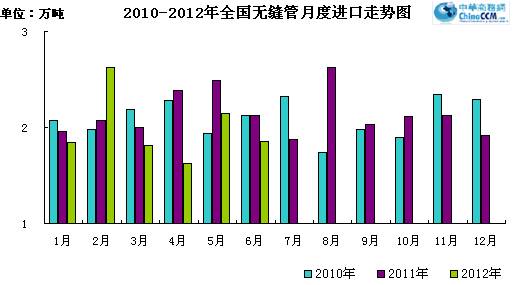 2012年6月份進口無縫管1.85萬噸,比去年同期少進口0.28萬噸,同比下降13.15%。6月份進口環比上月減少0.3萬噸,環比下降13.95%。2012年上半年累計進口無縫管11.9萬噸,同比降低8.81%。預計全年進口無縫管可超過23萬噸逼近24萬噸。