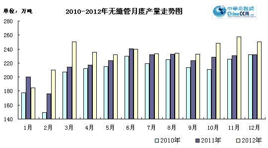 12月份國內(nèi)生產(chǎn)無縫管250萬噸,同比增長11%。環(huán)比11月份減產(chǎn)7.2萬噸,環(huán)比下降2.8%。2012年全年累計生產(chǎn)無縫管2819.7萬噸,同比增長8.8%。