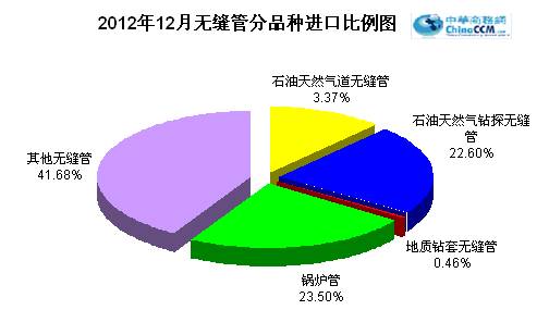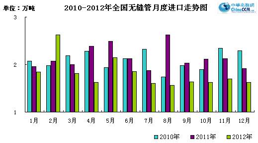 2012年12月份進口無縫管1.63萬噸,同比少進口0.19萬噸,同比下降9.9%。環(huán)比11月份少進口0.07萬噸,環(huán)比下降4.1%。2012年全年累計進口無縫管21.68萬噸,同比下降15.7%。