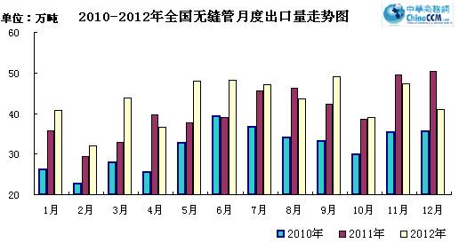 2012年12月份出口無縫管41.07萬噸,同比少出口9.39萬噸,同比下降18.6%。環(huán)比11月份少出口6.24萬噸,環(huán)比下降13.2%。2012年全年累計出口無縫管516.82萬噸,同比增長6.13%。