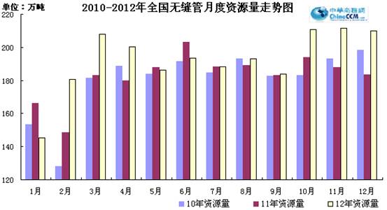 2012年12月份國內(nèi)無縫管新增資源量210.56萬噸,同比增加27萬噸,同比增長14.7%。環(huán)比11月份減少1.03萬噸,同比下降0.5%。2012年全年國內(nèi)無縫管新增資源量2314萬噸,同比增長5.78%。