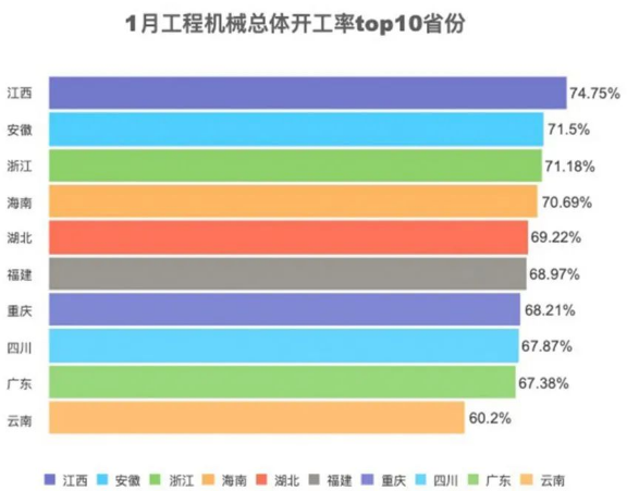 分省份來看,1月江西、安徽、浙江、海南開工率均越過70%,分別以74.75%、71.50%、71.18%、70.69%,位列全國前四。