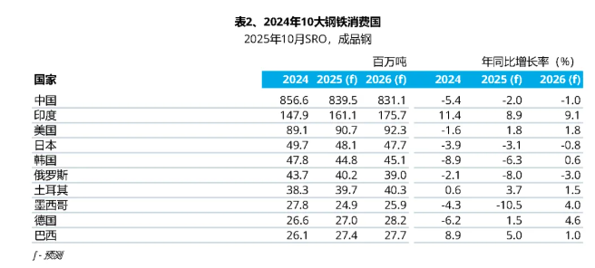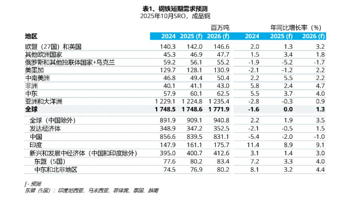 中國之外發展中國家的鋼鐵需求預計將實現穩健增長,2025年增長3.4%,2026年增長4.7%。其主要驅動因素來自印度以及部分東盟和中東北非國家的強勁表現。