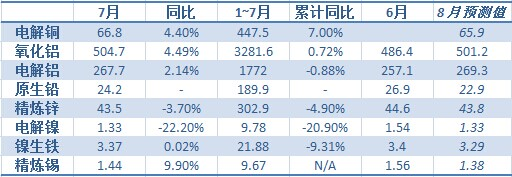 7月精煉錫產(chǎn)量同比增長9.9%,環(huán)比減少7.8%,減少原因是7月中旬中央環(huán)保督查組進入錫主產(chǎn)區(qū),導(dǎo)致所涉地區(qū)冶煉廠集中停產(chǎn),主要為云南、廣西和江西地區(qū);另有個別安徽地區(qū)企業(yè)受到暴雨侵襲被迫停產(chǎn)數(shù)日,產(chǎn)量有所減少。8月精煉錫產(chǎn)量預(yù)計為1.38萬噸,環(huán)比減少4.2%,主要考慮到8月上半月上述地區(qū)企業(yè)仍多數(shù)處于停產(chǎn)狀態(tài)。本次集中停產(chǎn)中,部分企業(yè)暫停污染較重的冶煉環(huán)節(jié),而7月份停產(chǎn)伊始仍可以精煉前期產(chǎn)出的中間產(chǎn)物,因此7月份受影響不大;8月份由于粗煉等環(huán)節(jié)停產(chǎn)導(dǎo)致中間原料減少,影響成品的最終產(chǎn)出,預(yù)計8月份整體產(chǎn)量還將較7月份進一步小幅下降。